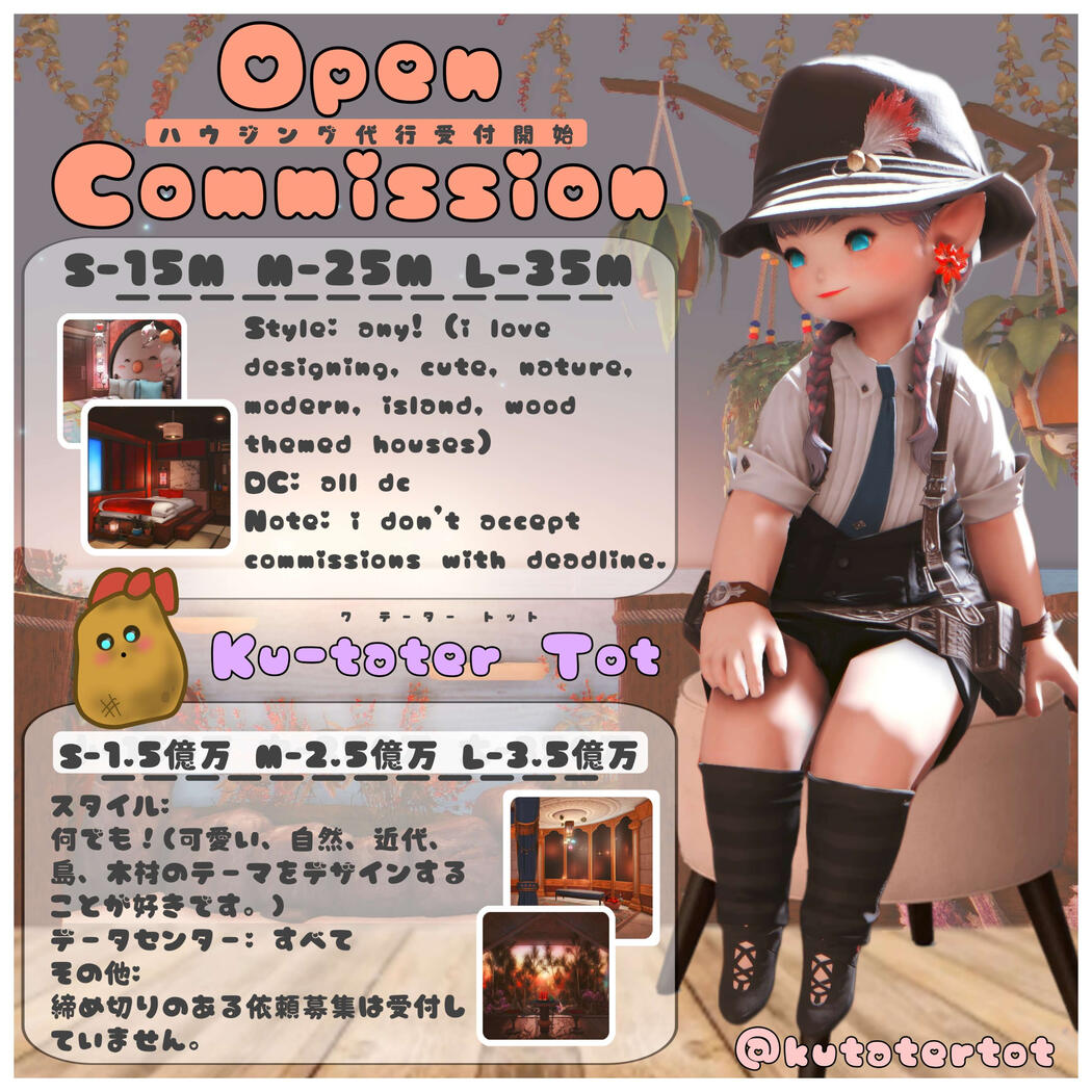 | Priority Conditions: 1) Commissions with no deadlines 2) No rushed commissions 3) 1 Floor Designer House (Most of the Designs in Featured Designs Pictures are 1floor Designer Houses) Please join my Discord Server for More info. | 優先条件: 1)締め切り無し 2)急ぎ作成じゃない 3)1階デザイナーハウス (有名なデザイン欄のほとんどは1階デザイナーハウスです。) その他の情報はDiscord Serverにてご確認ください。 |